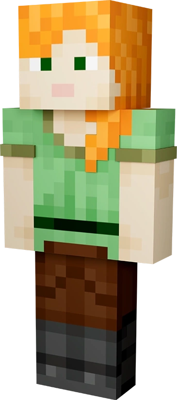 She appears to be a girl with Caucasian skin and being that she is a Minecraftian its cubed shape with orange hair, a green shirt, brown paints, gray shoes, and pink lips possibly standing as lipstick.