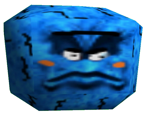 Mrs. Thwomp is a Thwomp with blue skin, black eyes, pink rosy cheeks, eyelashes and black marks on her body .