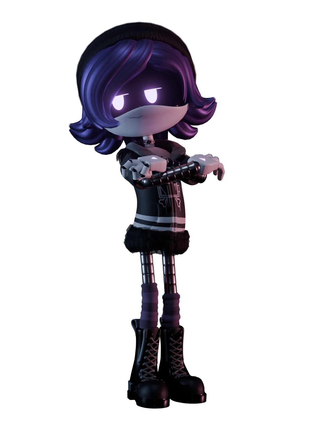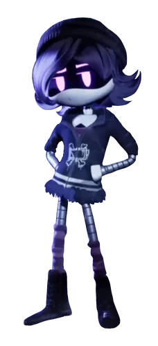 Uzi is a worker drone with purple eyes and hair. She also wears a beanie hat over it, black boots with striped long socks, and has a black hoodie. For a brief period her right hand's palm had a hole through it after she was attacked by Murder Drone Serial Designation N, but it was healed by N's saliva. In the epilogue of the pilot, Uzi's eyes temporarily turned yellow.
